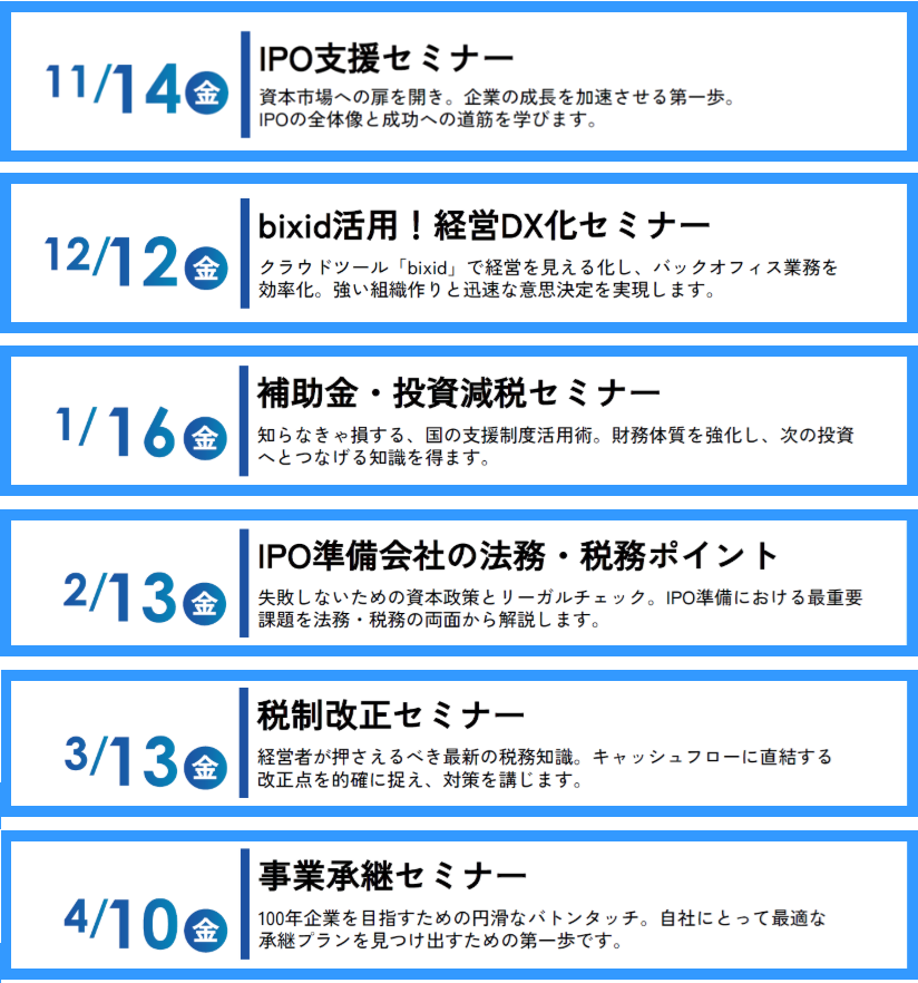 今回のセミナーでは、IPO支援・財務戦略・法務・税務・人事・事業承継など、各分野のプロフェッショナルが実務ベースで指南。